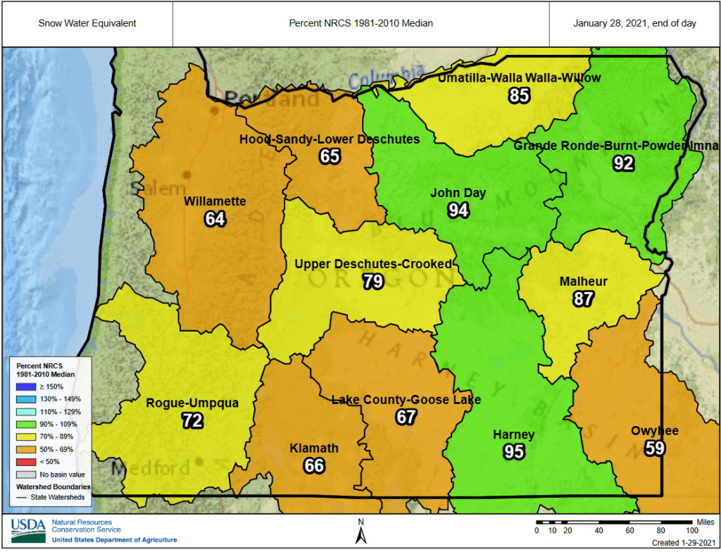 Here’s the latest snowpack data. As you can see, Central Oregon is well under normal. This could easily change in the next few months, but the amount of change required to return to “normal” is quite large. More than above normal snow, we need “normal” spring and summer temperatures, which are much cooler than we have seen in many years. It does little good to have a reasonable snowpack if it quickly melts. In the past, Central Oregon was blessed with large snowpack and cool temperatures which caused the water to be released slowly throughout the spring and summer.