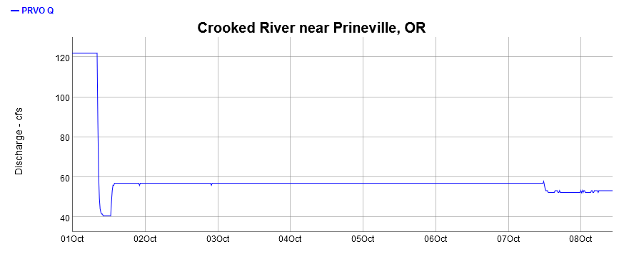 50 cfs released from Prineville is also far below what is needed by fish and aquatic species. Also concerning is the dramatic fluctuations that can occur. In only a few hours on October 1, the river went from over 120 cfs, to 40 cfs, to 57 cfs. As I write this it is at 53 cfs. Talk about stress on aquatic species!