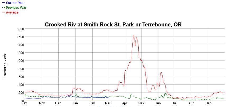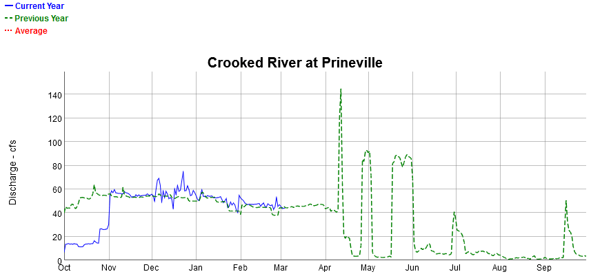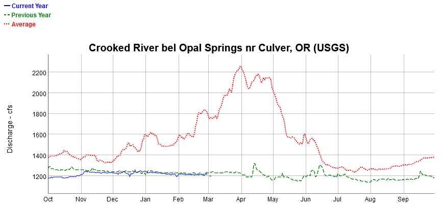 The Bureau of Reclamation has a series of gauges on the Crooked. Moving upstream from the mouth of the river near Lake Billy Chinook, the first gauge is below Opal Springs and shows that flows were well under normal, but they were sufficient for fish to migrate all last year (the green line).