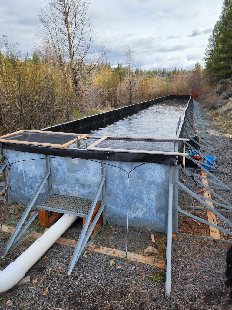 The photo above shows the tank next to a side channel of Whychus Creek where smolts are “acclimated” prior to being released into the creek. The idea is to imprint this water on the smolts so they will return to Whychus Creek as adults in approximately two years. In the foreground is the pump which draws water from the creek. The pump supplies water through a steel pipe to the far end of the tank and water is returned to the creek through the white PVC pipe at the near end. After a period of acclimation, typically a couple of weeks, a screen at the front of the PVC pipe is removed and the fish move into the creek. This is the beginning of their journey down Whychus Creek to the Middle Deschutes and then hopefully all the way to the Columbia River and the ocean.