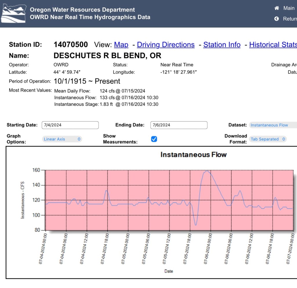 The hydroelectric facility malfunctioned and the water in the forebay overflowed at both ends. The water ran down to the river, digging large channels, and sending debris and sediment into the river which is clearly not good for fish and other aquatic species. ODFW prepared this document with much more detail. The graph below shows the sudden change in flow in the river during the incident.