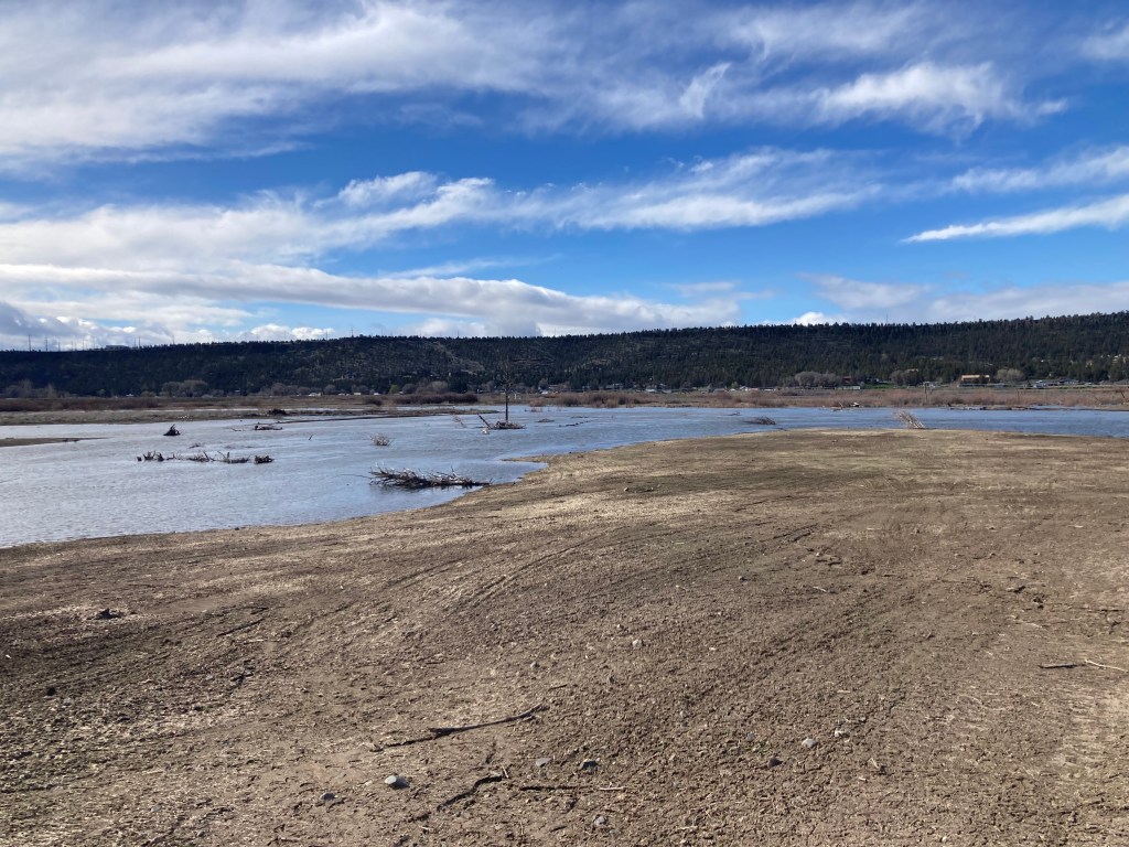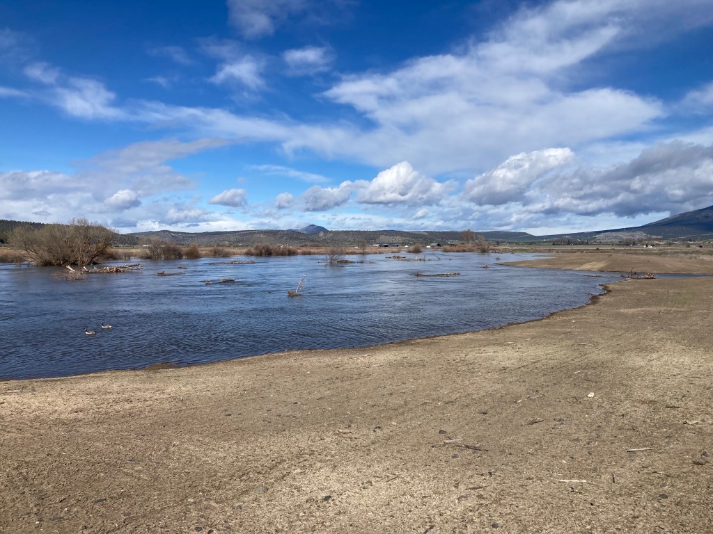 You are probably aware of the Deschutes Land Trusts’ Ochoco Preserve. It is a restoration project where Ochoco and McKay creeks meet the Crooked River. Flows in this section of the Crooked River are higher than below Bowman Dam during non-irrigation season due to tributary inflows. Here are some photos from DLT restoration specialist Jason Grant that he took yesterday when flows at the site were over 3,400 cfs. If you have visited the preserve you know that this is not how it normally looks. The good news is that the river can spread out at the preserve and do what rivers are supposed to do at high flows. Hopefully spawning steelhead have found their way to this project and even gone up McKay Creek.