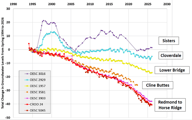 Here is a chart from a recent presentation by OWRD to the Deschutes Board of County Commissioners. It depicts groundwater levels as measured in several test wells. While some stability exists in wells close to the Cascade Mountains there are alarming decreases in the aquifer further away from the Cascades.