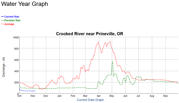 The notes from the latest Prineville Reservoir status meeting were recently released. This is a monthly meeting between the Bureau of Reclamation, other agencies, irrigation districts, and the City of Prineville. The BoR has determined that they will be able to maintain at least 80 cfs between whenever irrigation flows out of Bowman Dam are turned off through October 14th. After that, minimum flows will be 100 cfs until the beginning of irrigation season on April 14, 2026. They cautioned that Prineville Reservoir is still over 60% full so flows could be much higher at times in the winter for flood control purposes depending on rain and snowpack.