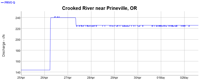 Last week was a typical example of how the Crooked River is managed by the Bureau of Reclamation and local irrigation districts with no concern for fish and wildlife. In only 45 minutes on April 26th, releases from Bowman Dam into the Crooked River rose from 144 cfs to 240 cfs. This started at 5:45 am and ended at 6:30 am. I hope no anglers or wildlife were wading in the river early that morning. Of course, a sudden surge of this magnitude will have stirred up considerable spawning bed clogging sediment.