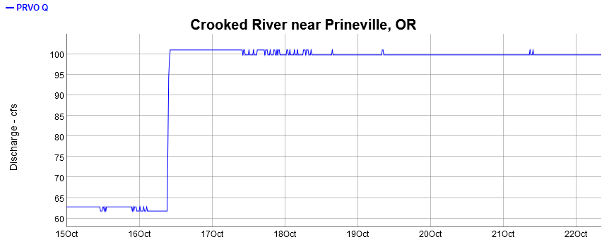 A reader asked me to look into what appears to be a very concerning rise in the Crooked River yesterday. Jeremy Giffin, our local water master, explained that this is a faulty reading as the recorder is being replaced this week and readings won’t be reliable for a while. The plan is to continue flows at around 50 cfs for many more months. Thanks to the reader who alerted me and to Jeremy for promptly responding to my inquiry.