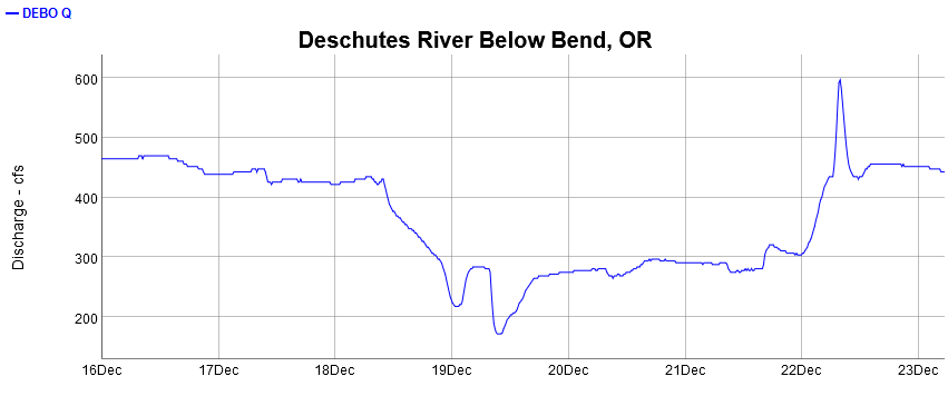 Central Oregon Irrigation District has now finished their latest “stock run” and you can see its impact on the Middle Deschutes below Bend.โOver the course of 5 days the river level has fluctuated wildly with a low of 172 cfs and a high of 592 cfs.โSuch dramatic swings in a short period of time expose the river bed and its plants and aquatic insects to potentially lethally low temperatures.โHigh flows then generate sediment which chokes spawning beds.โOf course, this has been going on for years.โWith all the focus on restoring the Upper Deschutes (the river above Bend), the Middle Deschutes continues to be an irrigation ditch.