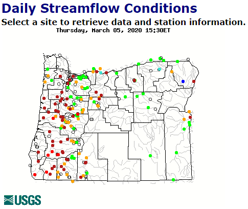 February was one of the driest months on record for Oregon and the effects can really be seen in our rivers. Here is a graph from the USGS site showing current levels. I have regularly looked at this site for many years and never seen so much red. Even the Deschutes is below the 10th percentile of normal flows! Our local snowpack is now 82% of normal and Central Oregon is currently classified as being in a moderate drought. None of this is good news for fish.